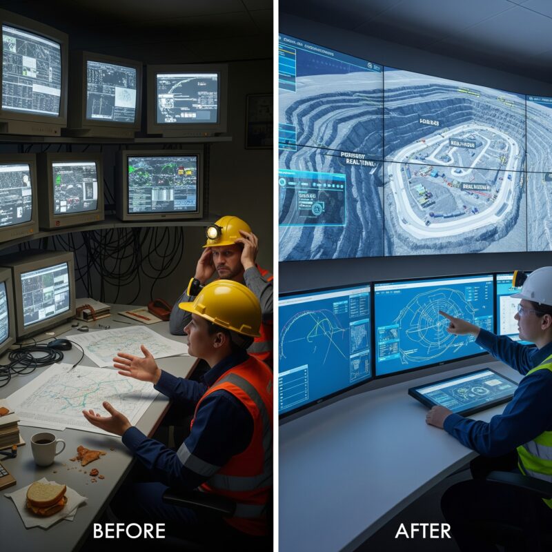 Multiple flat screens showing different system interfaces that don’t talk to each other. Spreadsheets with production numbers that are already 2 hours old. Radio chatter that dispatchers have to mentally translate into spatial understanding. Paper maps with hand-drawn equipment locations. Separate screens for weather, maintenance, safety alerts, and production tracking.